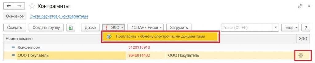 1С-ЭДО встроен в типовые конфигурации, поэтому весь процесс — от получения документов до отправки ответов — происходит внутри программы. Информация о контрагенте, подключенном к ЭДО, отображается прямо в справочнике Контрагенты. Для начала обмена достаточно нажать кнопку ЭДО и выбрать Пригласить к обмену электронными документами.