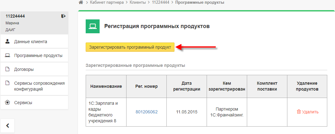 Нажмите на кнопку Зарегистрировать программный продукт, заполните форму и подтвердите данные. После того как вы выполните все действия, программный продукт появится в сервисе 1С ИТС личный кабинет.