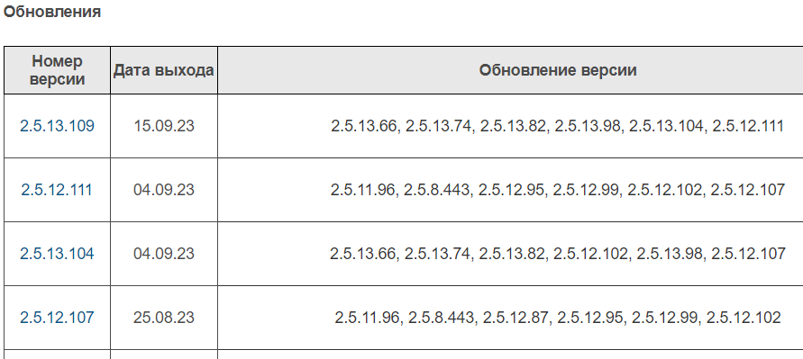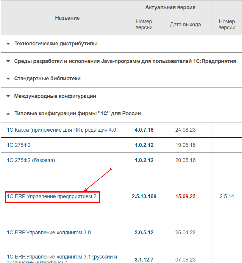 Чтобы скачать файлы обновлений, кликните на название конфигурации в списке. В открывшемся окне появится перечень всех доступных релизов.