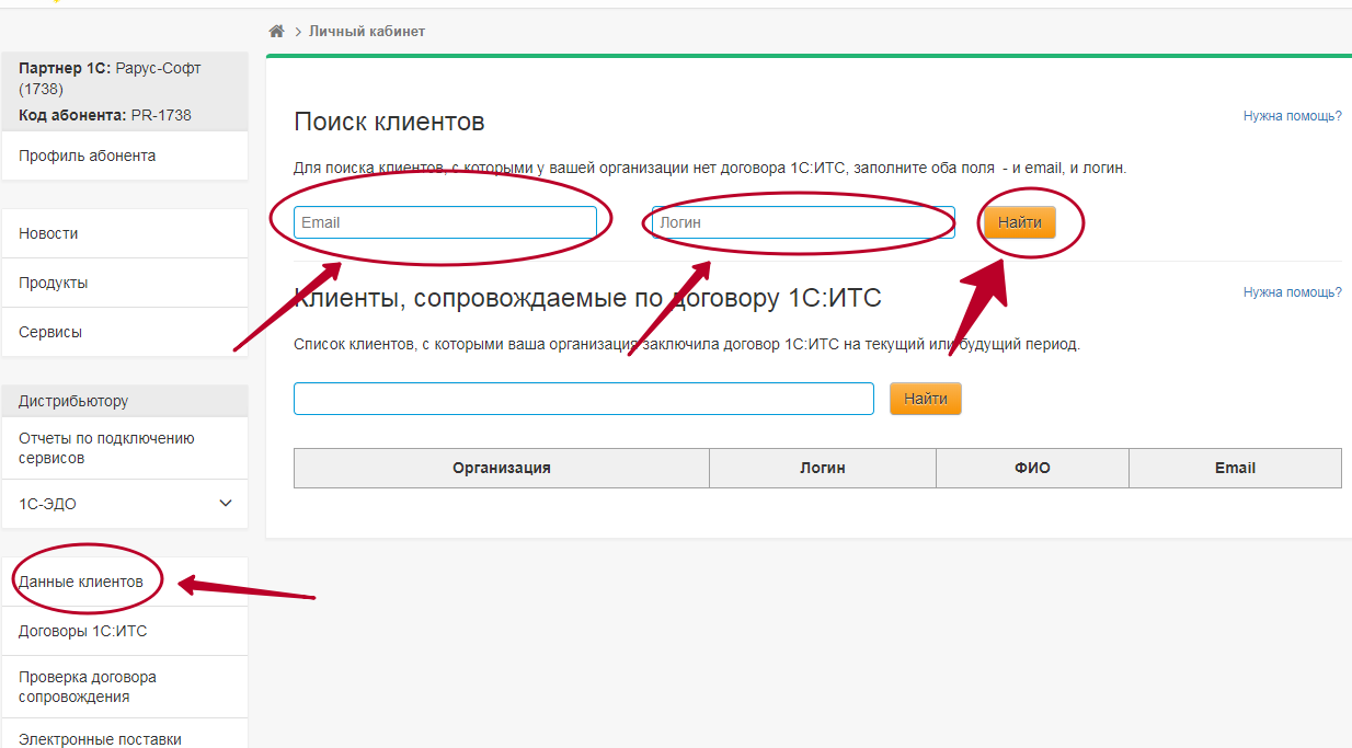 Клиенты на сопровождении. Их можно найти в разделе Данные клиентов в кабинете партнера по названию организации, ИНН, логину, Ф. И. О. или email. Воспользуйтесь поиском в центре страницы.