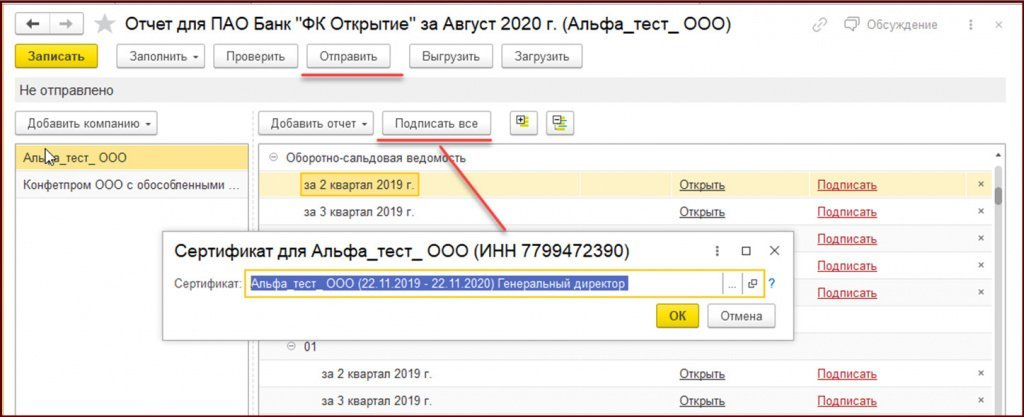 Если банк требует подписи только основной организации, появляется кнопка Подписать для заверения отчетности всей группы. Перед отправкой пакет можно проверить по кнопке Проверить, а затем отправить по кнопке Отправить.