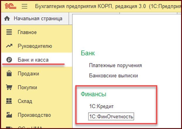 Чтобы открыть сервис 1С:ФинОтчетность в «1С:Бухгалтерия», перейдите в раздел Банк и касса, подраздел Финансы и выберите пункт 1С:ФинОтчетность. В простом интерфейсе «1С:Бухгалтерия» сервис доступен через раздел Деньги.