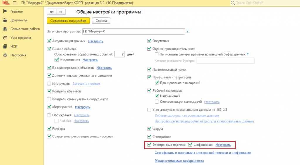 Подключение электронной подписи в «1С:Документооборот» выполняет администратор с полными правами. Необходимо указать используемые в компании криптографические средства для работы с ЭП и шифрованием.