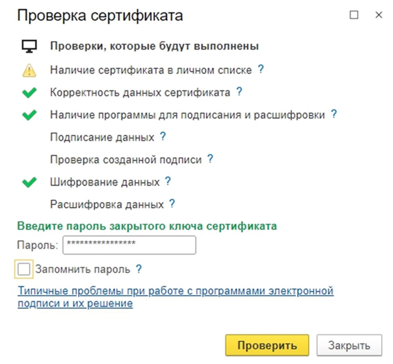 Откройте нужный сертификат, введите пароль и нажмите Проверить.