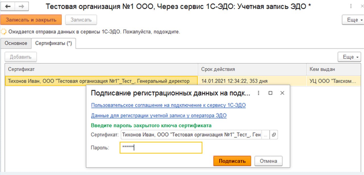 Подпишите регистрационные данные, выбрав сертификат электронной подписи и нажав Подписать.