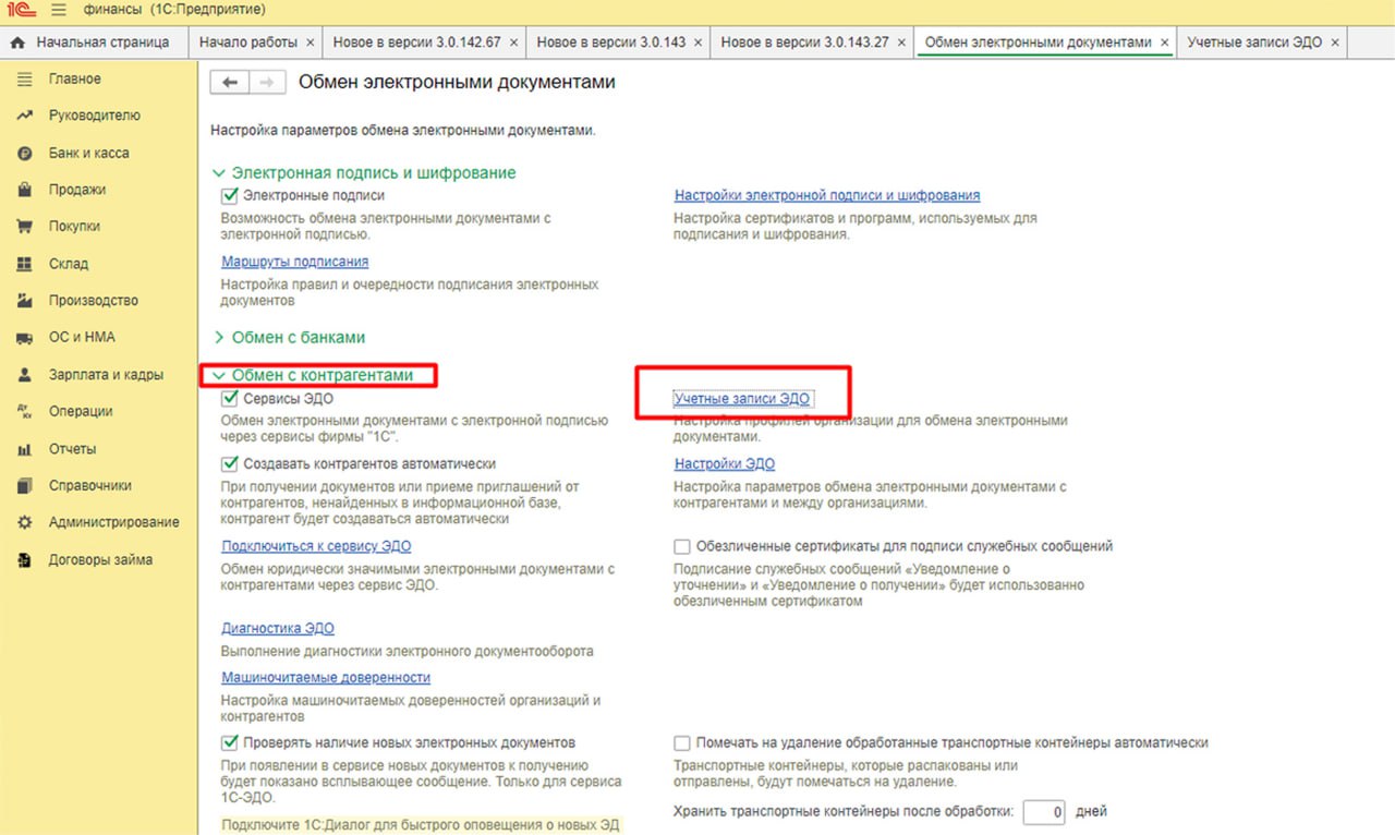 Факт подключения ЭДО отображается в программе 1С. Для проверки: