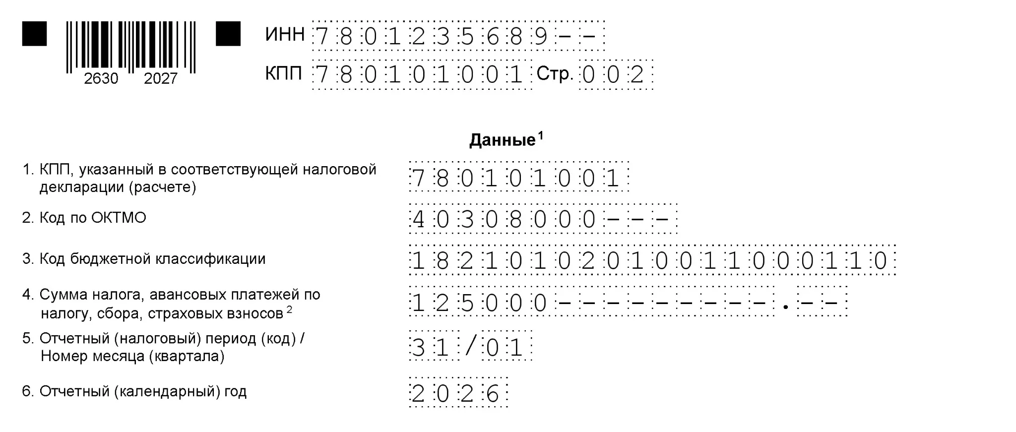 В верхней части повторяются ИНН и КПП. В одном уведомлении можно отразить несколько платежей — для этого предусмотрены повторяющиеся блоки из шести строк. При необходимости добавляются дополнительные листы, если места недостаточно. В одном уведомлении допускается указывать платежи обособленных подразделений вместе с головной организацией.