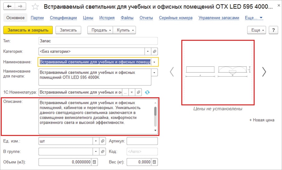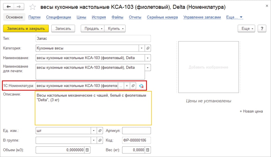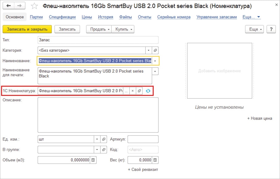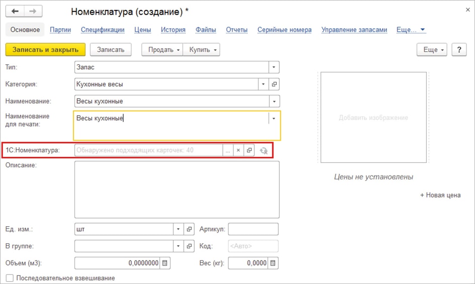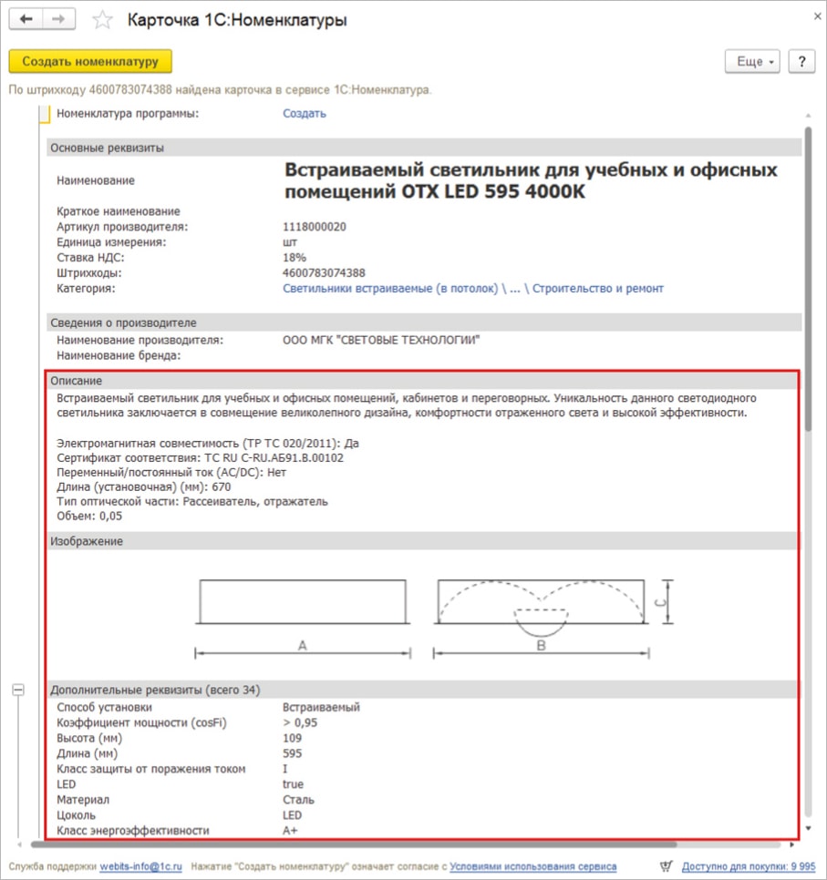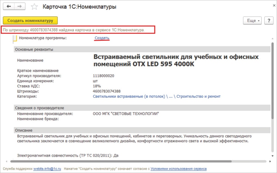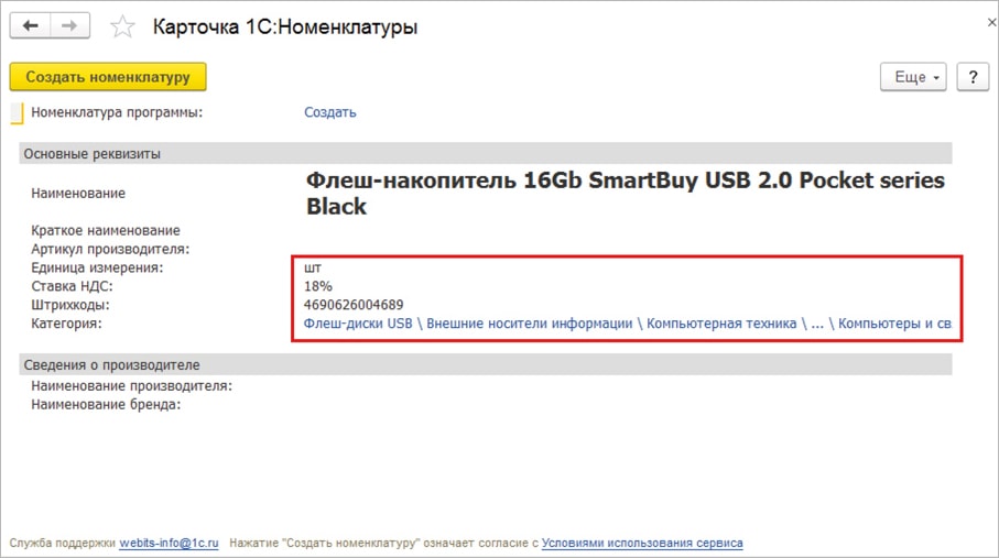 Откроется карточка товара в сервисе 1С:Номенклатура. Для добавления приобретенной карточки в базу используйте кнопку Создать номенклатуру или гиперссылку Создать.