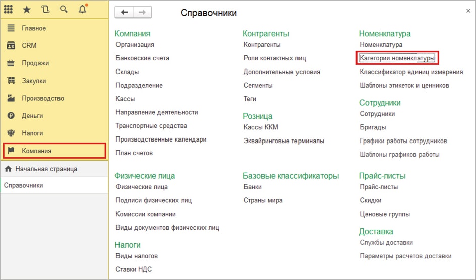 Для загрузки категорий перейдите в раздел Компания — Номенклатура и откройте ссылку Категории номенклатуры.