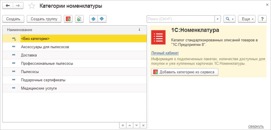 Категории номенклатуры используются для удобной классификации справочника «Номенклатура» и ускоряют заполнение данных по новым позициям на основе перечня свойств и значений, предоставляемых сервисом 1С:Номенклатура.