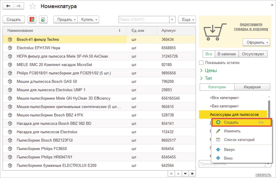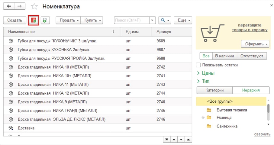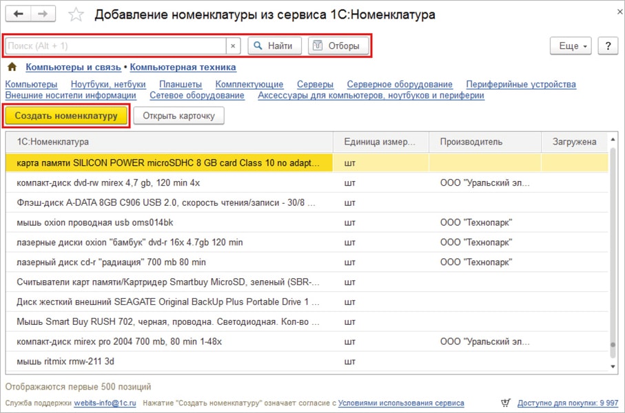 Откройте справочник Номенклатура и выберите команду Добавить номенклатуру из сервиса 1С:Номенклатура. Чтобы найти подходящую позицию номенклатуры, используйте инструменты поиска, фильтрацию по категориям и дополнительные отборы.