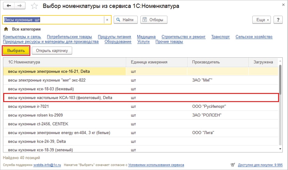 Если соответствующие карточки найдены, пользователь может привязать номенклатуру базы к карточке сервиса и заполнить данные на ее основе. Для этого нажмите на кнопку Выбрать.