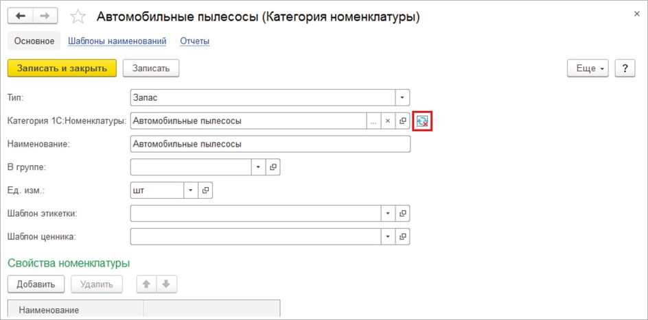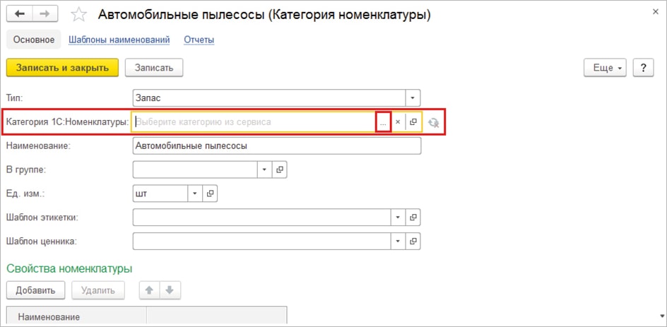Привязка категорий базы к категориям сервиса 1С:Номенклатура выполняется через поле Категория 1С:Номенклатуры в карточке категории номенклатуры.