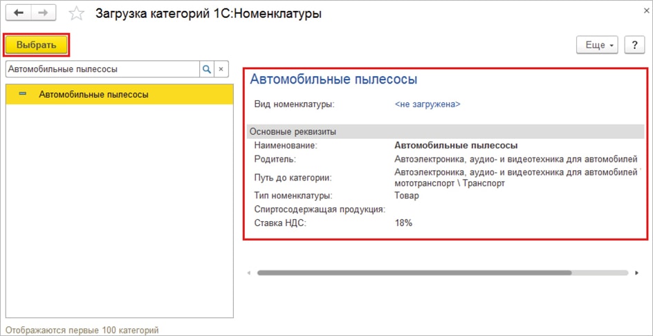 Отметьте флажками нужные категории сервиса «1С:Номенклатура» и нажмите Загрузить категории. При выборе категории в дереве доступен просмотр ее карточки с описанием основных и дополнительных реквизитов. В поле Вид номенклатуры отображается информация о том, загружена ли категория в базу 1С.