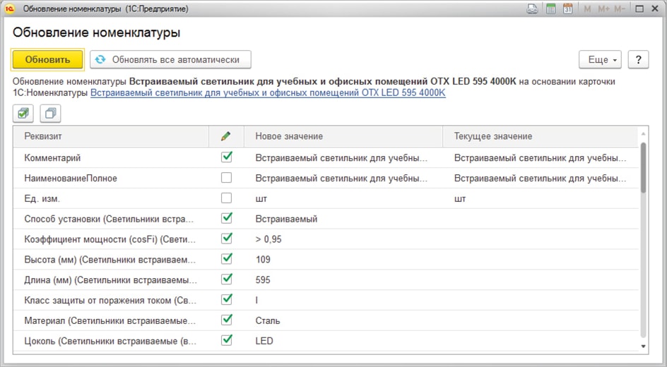 Если значения реквизитов категории в базе отличаются от данных сервиса 1С:Номенклатура, они отображаются в списке реквизитов. Для исключения отдельных реквизитов из обновления необходимо снять соответствующие флаги.