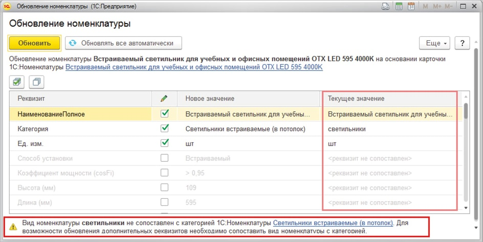Если категория номенклатуры не сопоставлена с категорией сервиса 1С:Номенклатура, часть информации может не загружаться. В этом случае система выводит соответствующее уведомление.