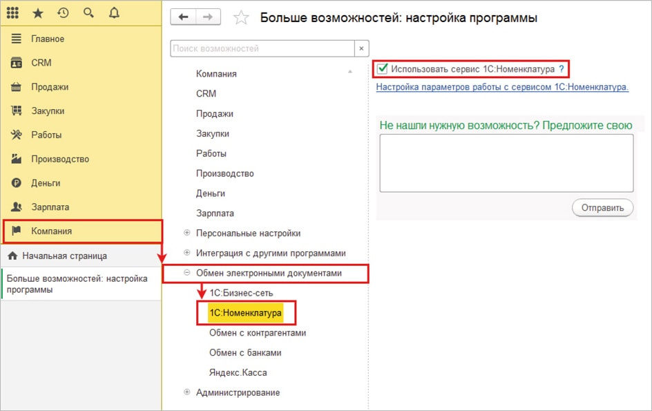 Чтобы активировать возможность работы с сервисом 1С:Номенклатура в 1С:УНФ, перейдите в раздел Компания. Выберите пункт Обмен электронными документами → 1С:Номенклатура. Установите флажок Использовать сервис 1С:Номенклатура.