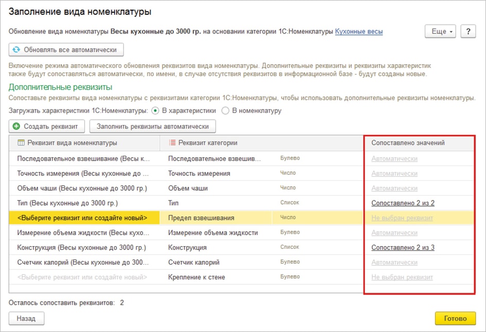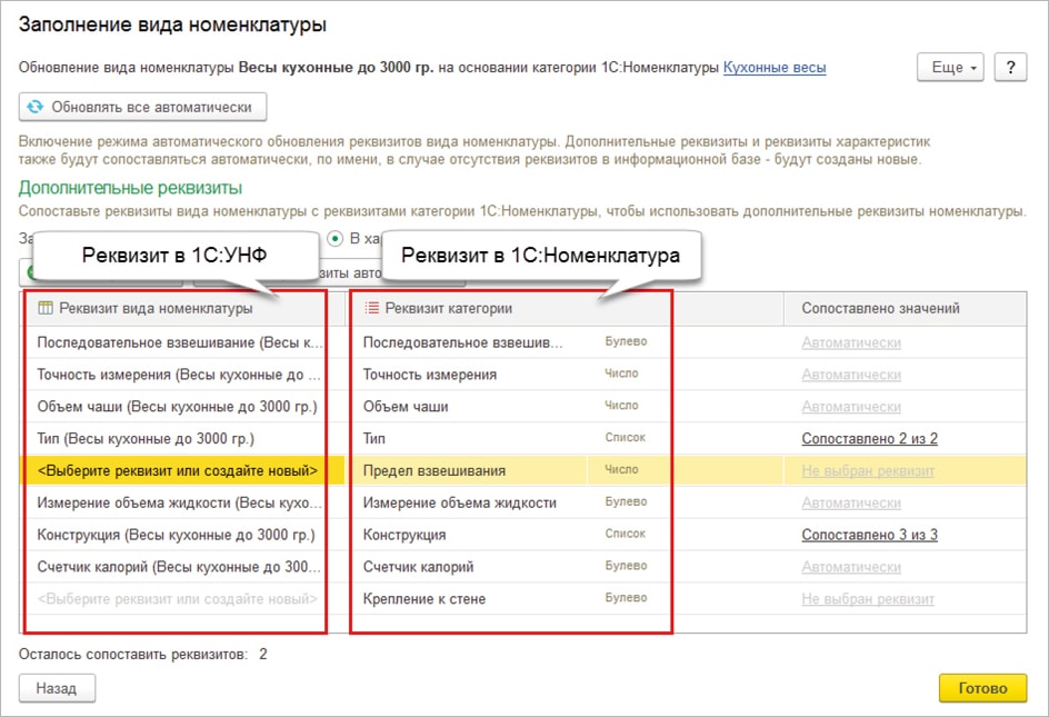 Для полного обновления категорий требуется сопоставление не только основных, но и дополнительных реквизитов. Для этого используется кнопка Настроить дополнительные реквизиты. Откроется форма Заполнение вида номенклатуры с сопоставлением реквизитов категории в 1С:УНФ и категории сервиса 1С:Номенклатура.