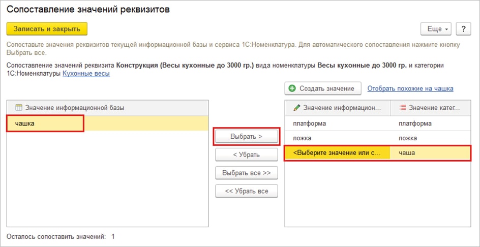В окне сопоставления необходимо выбрать соответствующие значения информационной базы. Для группового сопоставления доступна команда Выбрать все. Сохраните результаты группового сопоставления.