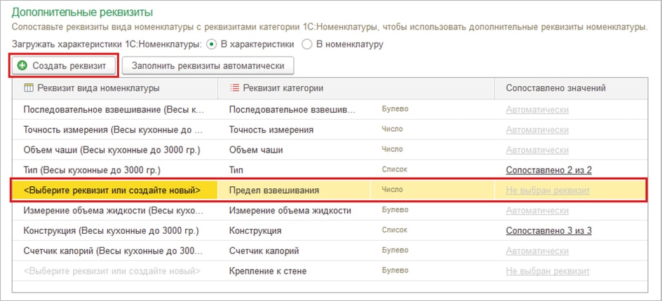 Если в базе отсутствуют значения, соответствующие значениям категории сервиса, их можно создать с помощью кнопки Создать реквизит.