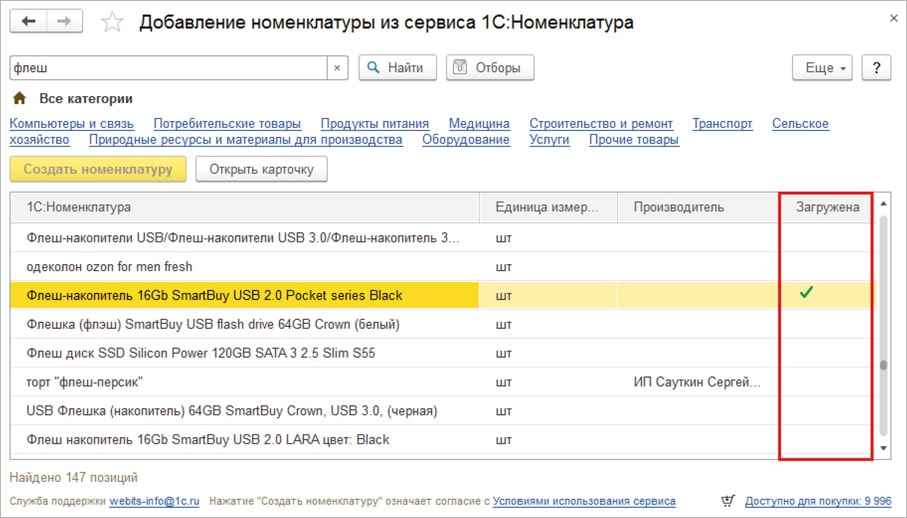 Все товары и категории, загруженные из сервиса 1С:Номенклатура, могут автоматически дополняться и обновляться данными сервиса.