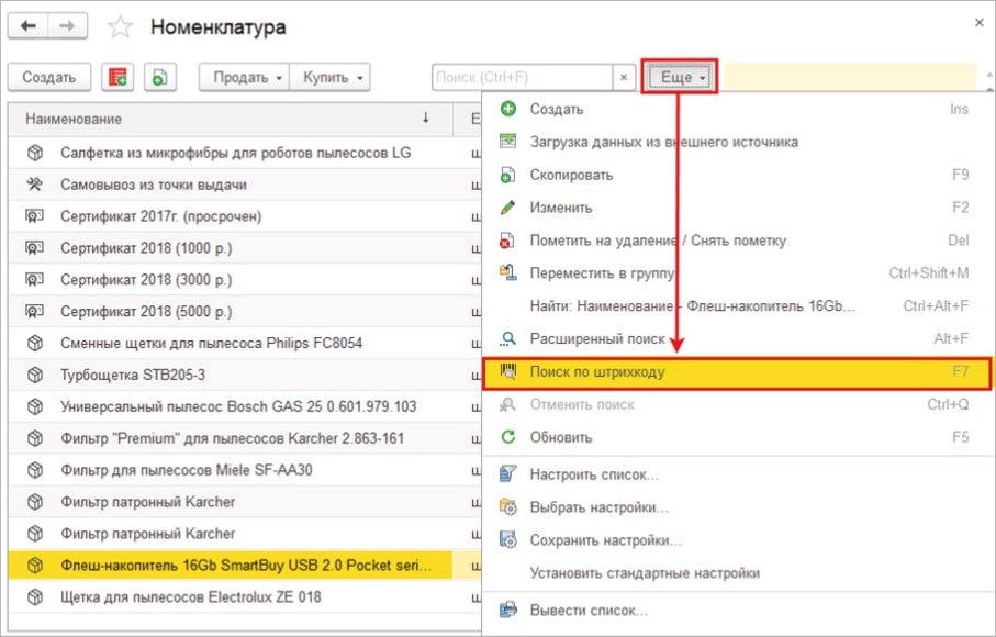 Для поиска перейдите в справочнике Номенклатура в меню Еще — Поиск по штрихкоду, введите штрихкод и нажмите ОК. Система будет искать номенклатуру сначала в вашей базе, затем в сервисе «1С:Номенклатура».