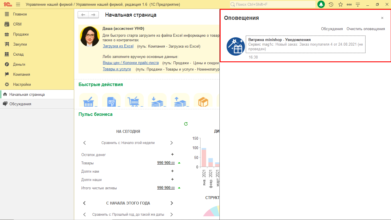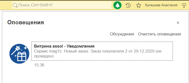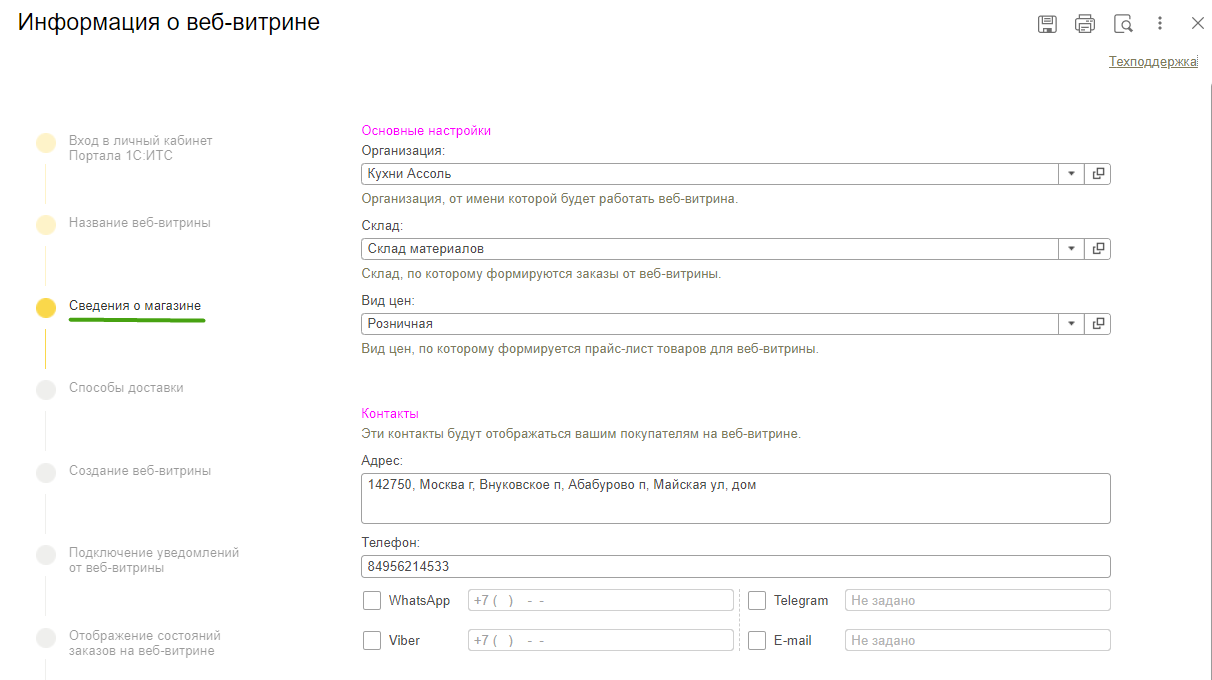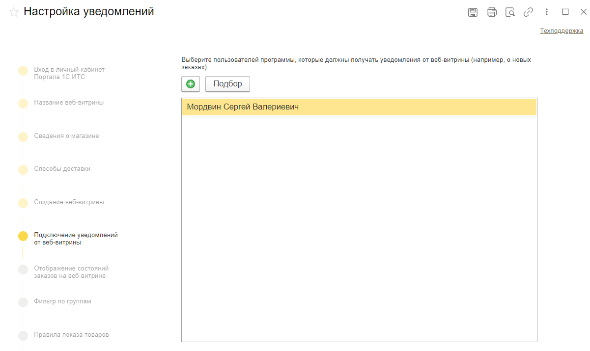 После заполнения данных запускается создание веб-витрины и регистрация сайта. Уведомления о новых заказах из веб-витрины будут автоматически поступать в 1С:УНФ. Можно настроить список пользователей, которые будут их получать.