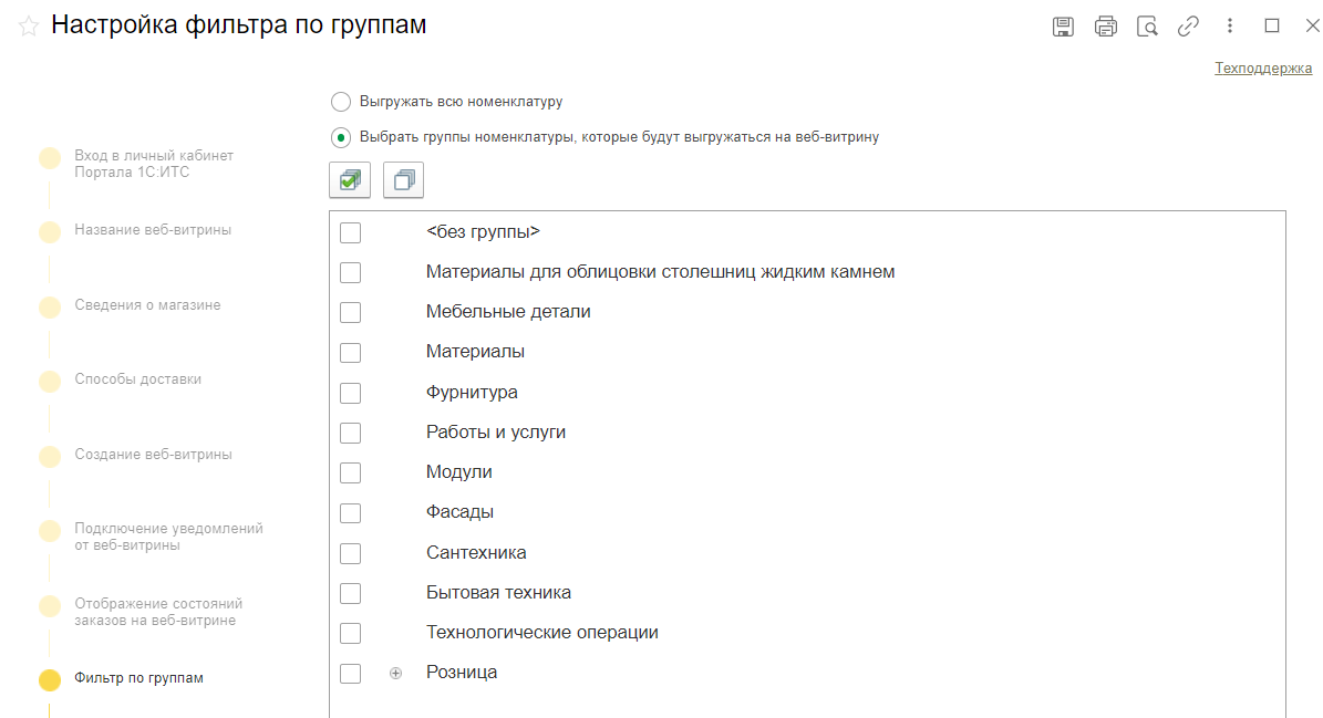 В настройках фильтров укажите группы товаров, которые будут отображаться на сайте. Если нужно выгрузить весь ассортимент, оставьте активным параметр Выгружать всю номенклатуру — дополнительные настройки не потребуются.