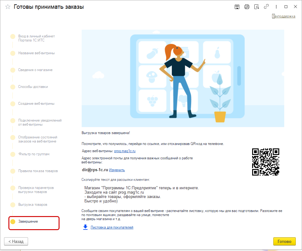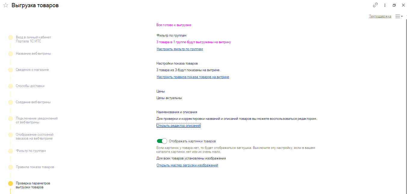 После запуска выгрузки система уведомит о готовности веб-витрины к приему заказов. На экране будут доступны: