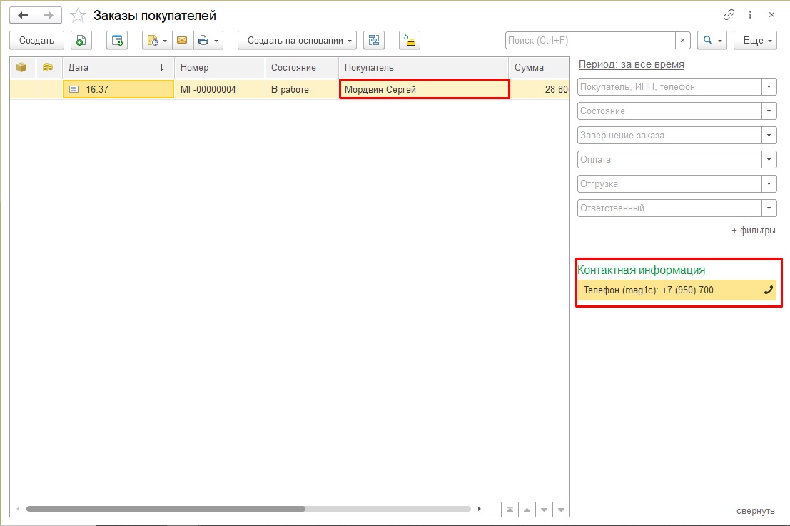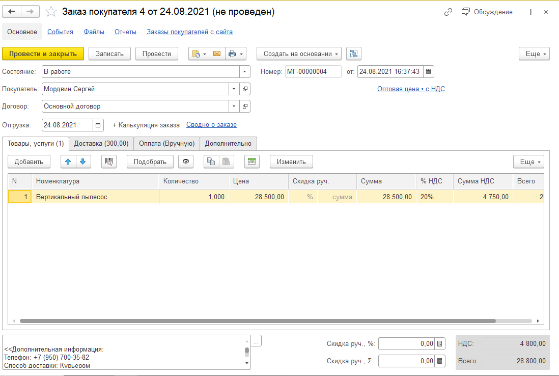 В документе отображаются данные клиента и контактный номер телефона. Заказ поступает непроведенным. В комментариях фиксируются способ оплаты, доставки и пожелания покупателя.
