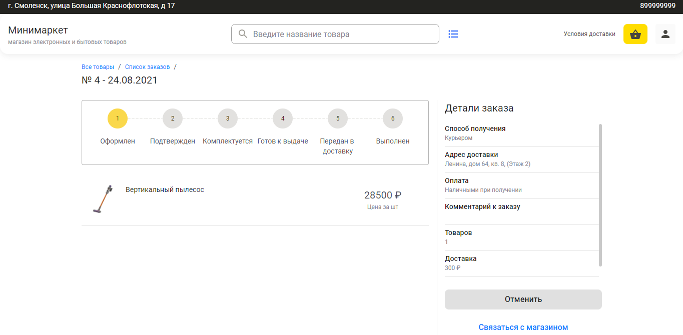 Затем подтверждает заказ. Статус заказа можно отслеживать прямо на сайте.