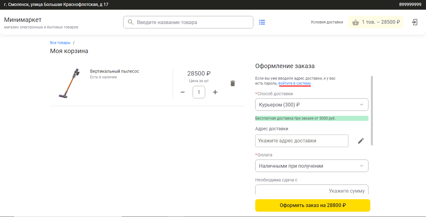 Для оформления заказа требуется авторизация. После регистрации клиент указывает:
