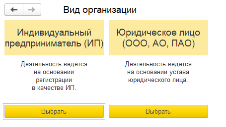 Чтобы создать новую организацию в 1С, выберите ее тип: ИП или юридическое лицо. Укажите нужный вариант.