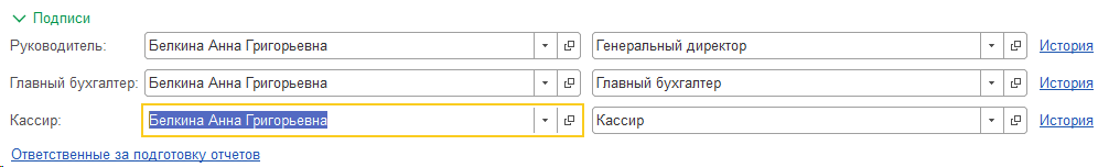 В разделе Подписи указываются ответственные лица организации, чьи данные используются при подписании документов. Эти сведения выводятся в печатных формах. Изменения вносятся через гиперссылку История. Здесь же можно назначить ответственных за подготовку отчетов — в бухгалтерском и налоговом учете, статистических отчетов.