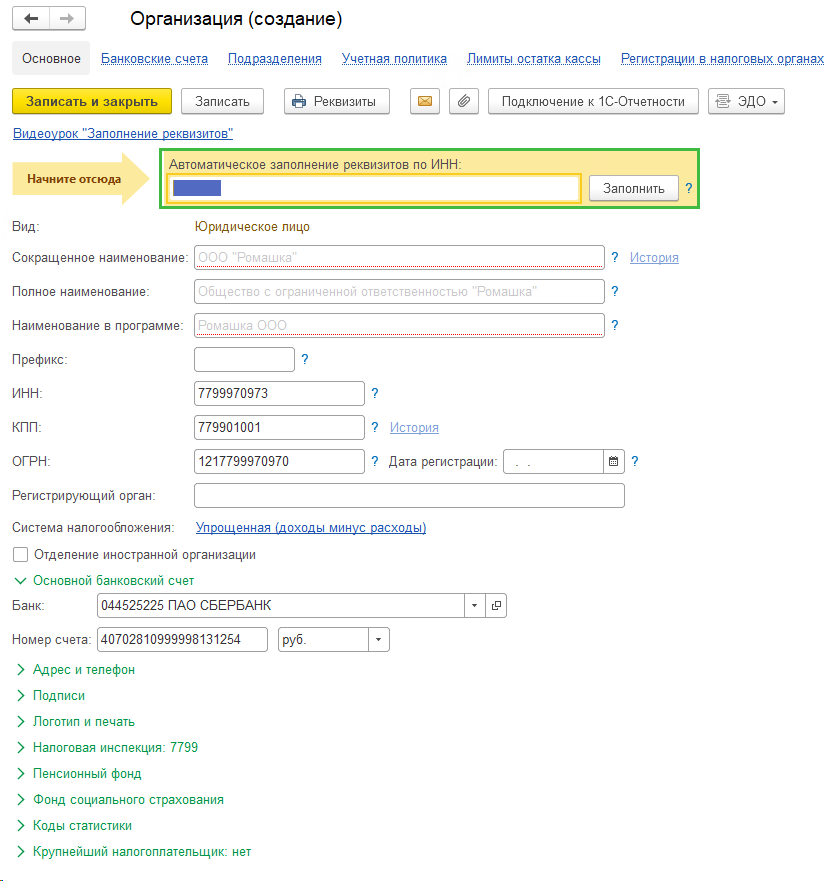 После выбора откроется карточка организации. Ее можно заполнить вручную либо автоматически по ИНН, используя сервис 1С:Контрагент.