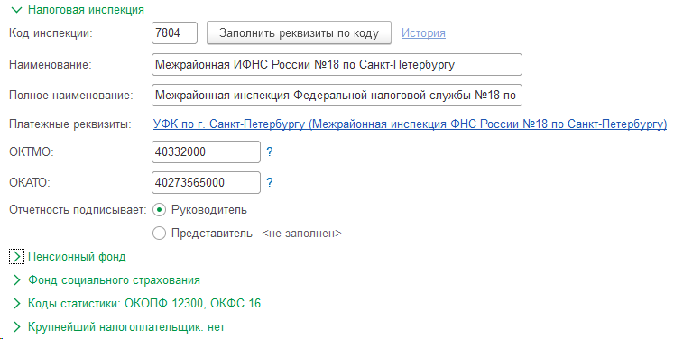 В разделе Налоговая инспекция заполните данные в соответствии с учредительными документами организации. После внесения информации нажмите Записать.