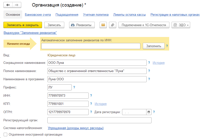 В карточке отображается выбранный ранее вид организации, например, Юридическое лицо. Изменить его нельзя. Если на этом этапе вы допустили ошибку, организацию нужно удалить. В этом случае, чтобы добавить новую организацию в 1С, вам придется начать заново.