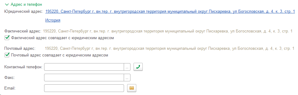 Разверните вкладку Адрес и телефон. Чтобы заполнить юридический, фактический и почтовый адреса нажмите ссылку Заполнить справа. Откроется отдельное окно для ввода данных.