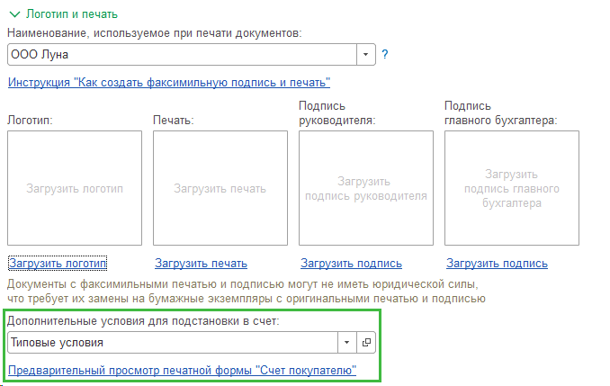 Факсимиле можно предварительно распечатать и затем загрузить в программу. Также доступен предварительный просмотр печатной формы через специальную ссылку. В этом разделе можно задать особые условия, которые будут автоматически отражаться в счетах от вашей организации.