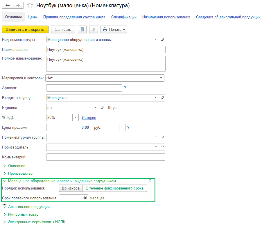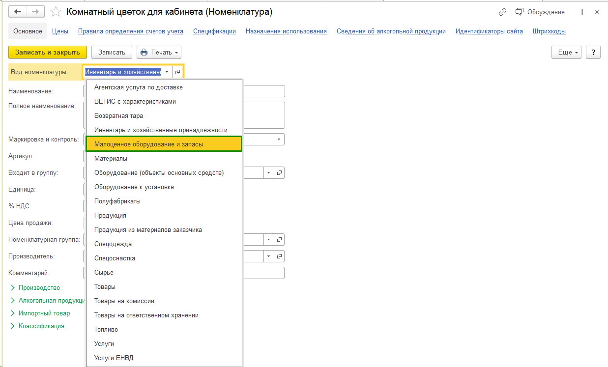 В 1С появился отдельный вид номенклатуры — «Малоценное оборудование и запасы».