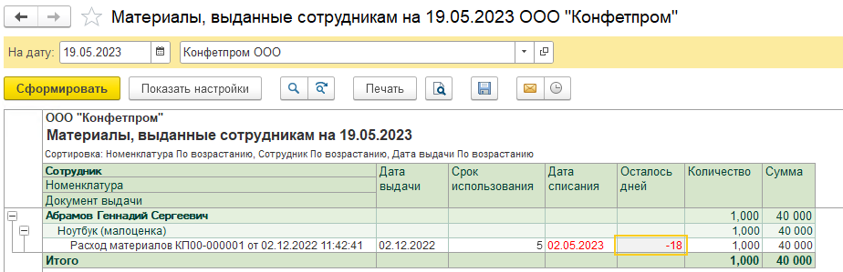 Проверить малоценные объекты и сроки их списания можно через отчет: Склад — Материалы, выданные сотрудникам.