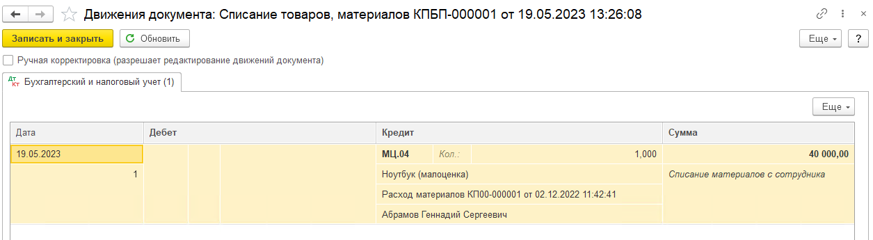 После проведения документа списания формируются соответствующие бухгалтерские проводки, отражающие выбытие объектов из учета.