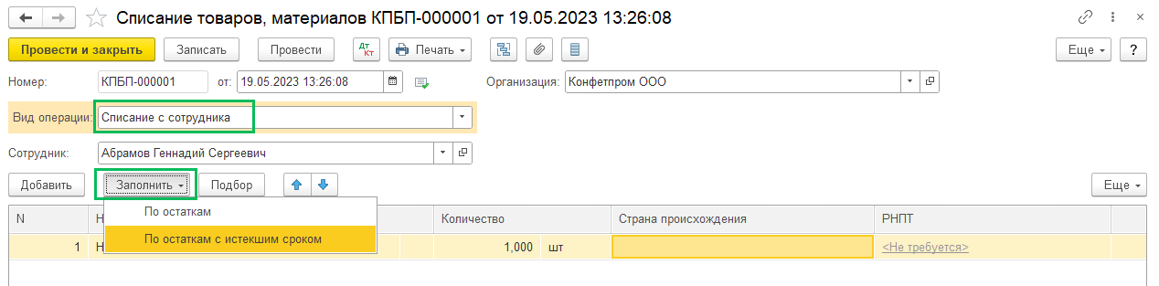 Склад — Списание товаров, материалов. Вид операции — «Списание с сотрудника».