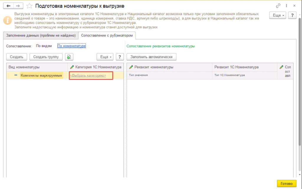 5. Подготовьте номенклатуру к выгрузке, сопоставив вид номенклатуры базы с категорией сервиса 1С:Номенклатура.