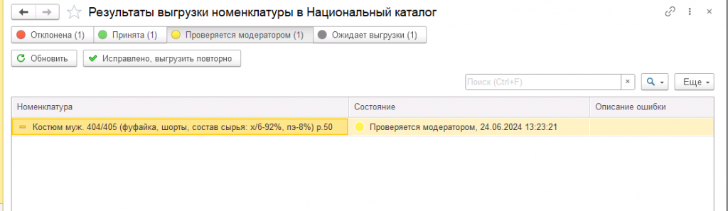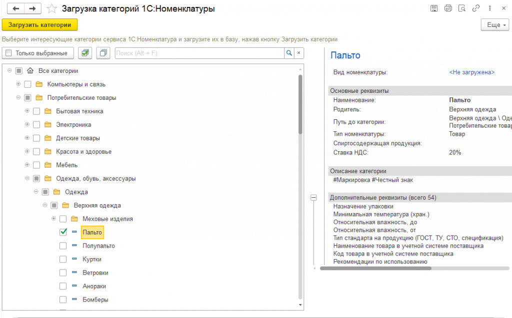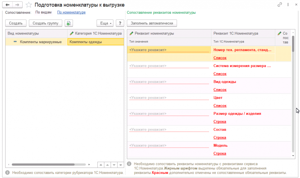 При выгрузке в Национальный каталог необходимо сопоставить поля номенклатуры с полями каталога. Для одежды в настоящее время обязательны: