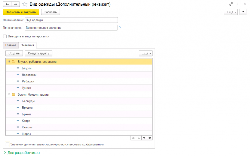 Для комплектов добавляется реквизит Комплект (булево: да/нет). Некоторые поля имеют предопределенные варианты значений. Например, для поля «Пол» доступны варианты: без указания, детский, женский, мужской, унисекс. Другие параметры, например цвет, можно создавать самостоятельно в базе, обязательно заглавными буквами — пример: ЛАВАНДОВЫЙ.