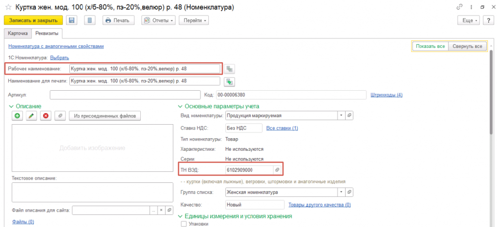 В типовой конфигурации обычно присутствуют только Код ТНВЭД и Бренд. Остальные поля нужно создать вручную: