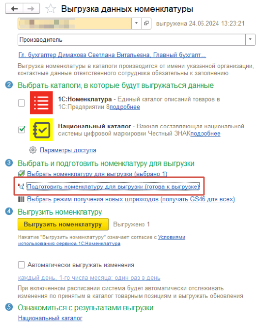 3. Выберите номенклатуру для выгрузки через поиск или установку отборов.
