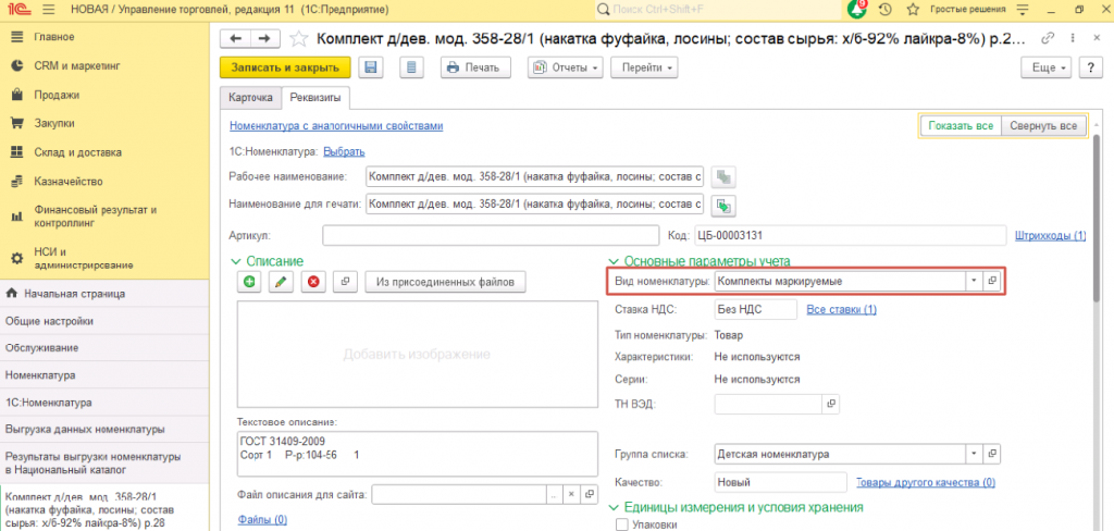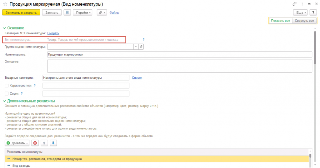 Далее убедитесь, что в базе есть вид номенклатуры с типом Товар и особенностью учета Товары легкой промышленности и одежда. Если такого нет, создайте новый или измените существующий.