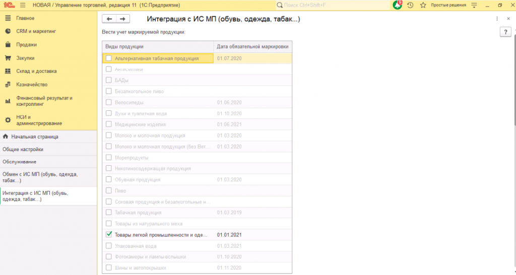 Сначала нужно убедиться, что включен учет маркированной продукции. Перейдите в раздел Интеграция с ИС МП (обувь, одежда, табак) и поставьте галочку напротив вида продукции Товары легкой промышленности и одежда.